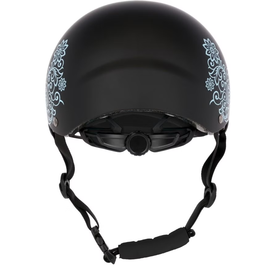 Ridehjelm til barn i slankt design med stillisert mønster av hest og blomster