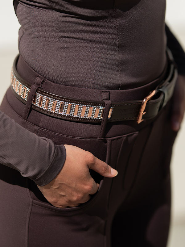 Det unike brun/lilla skinnet er dekorert med inngravert ES-logo, glitrende roségull-krystaller og en matchende beltespenne i roségull. Beltet er 3 cm bredt og kombinerer luksus, stil og bærekraft.