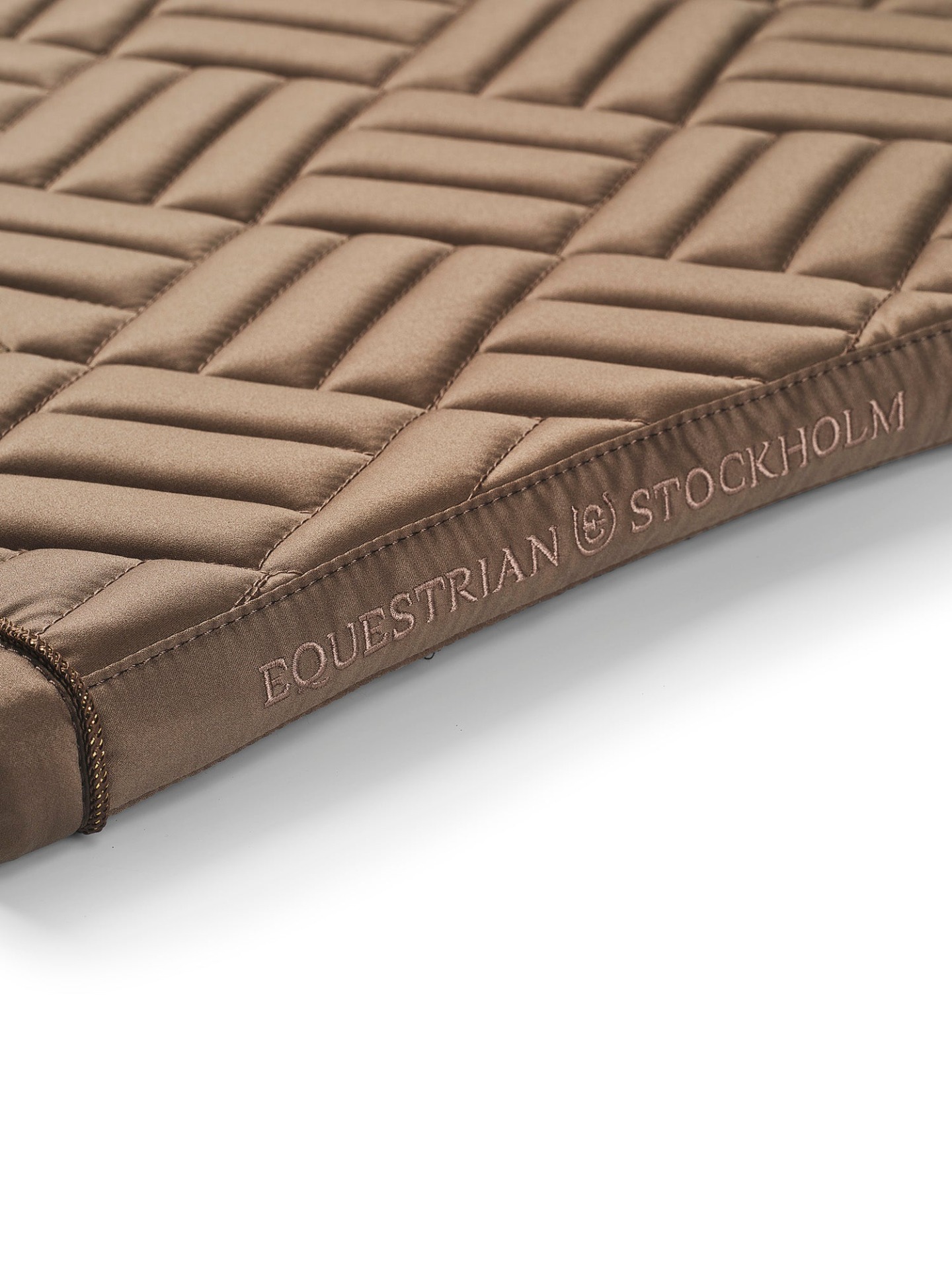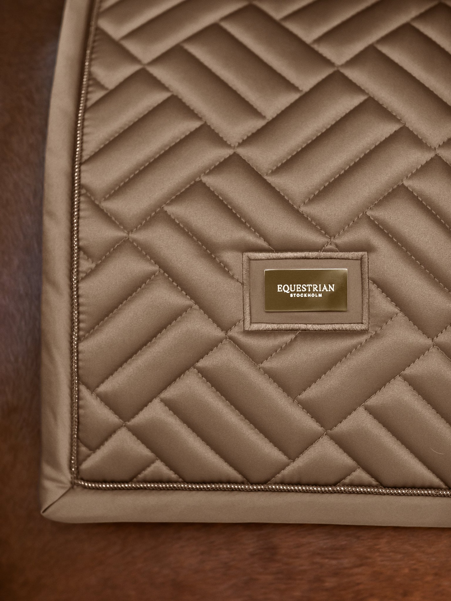Elegant sjabrak med moderne quilting i champagne med lekre gulldetaljer. Dekorert med Equestrian Stockholm-merke i gull.