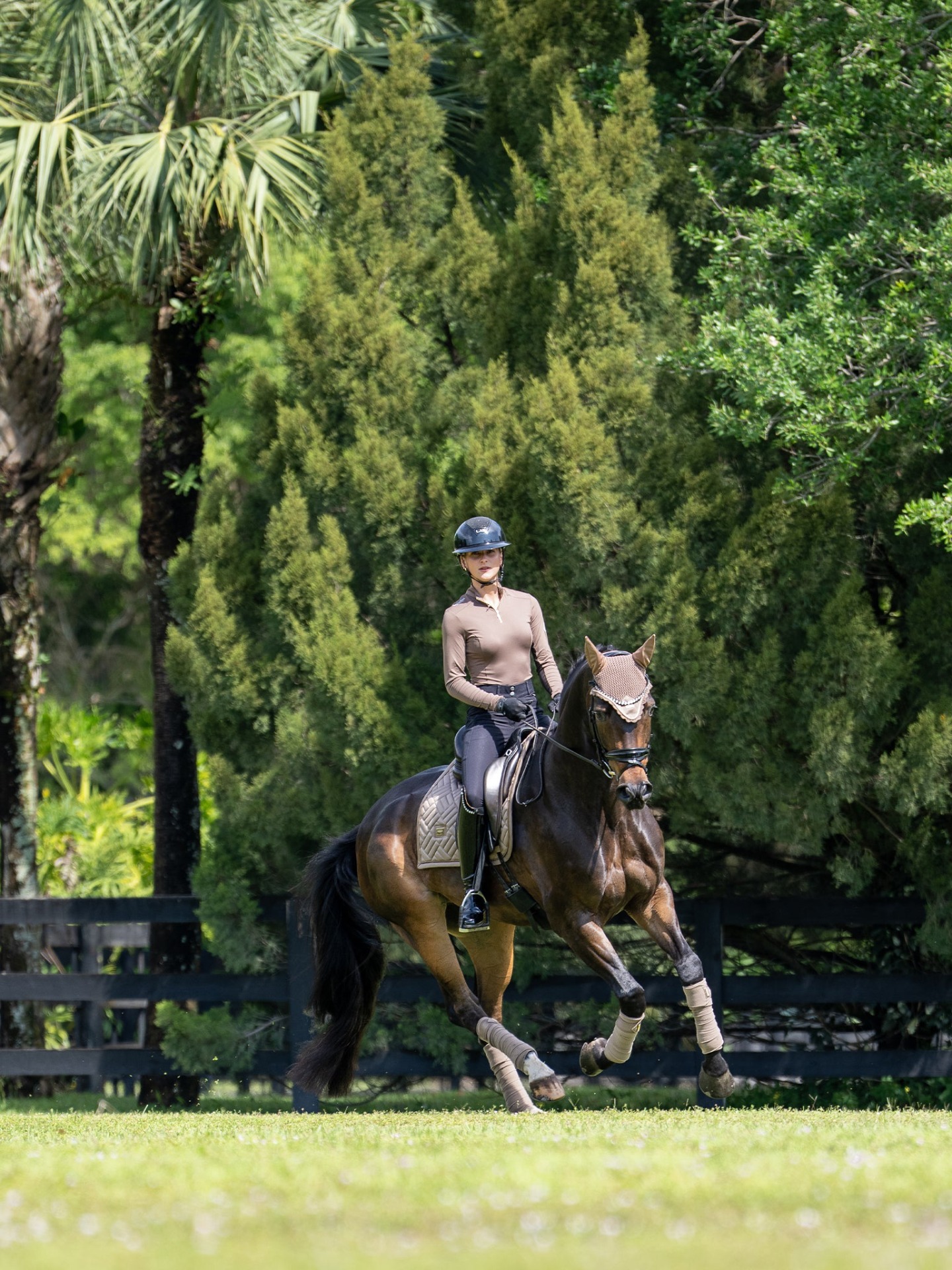 Detaljer: Champagne kantbånd med gullfarget Equestrian Stockholm-logo / Moderne quilting