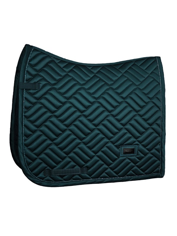 Elegant sjabrak med moderne quilting i mørkegrønn med et hint av blått, kombinert med sorte detaljer. Dekorert med Equestrian Stockholm-merke i sort metall.