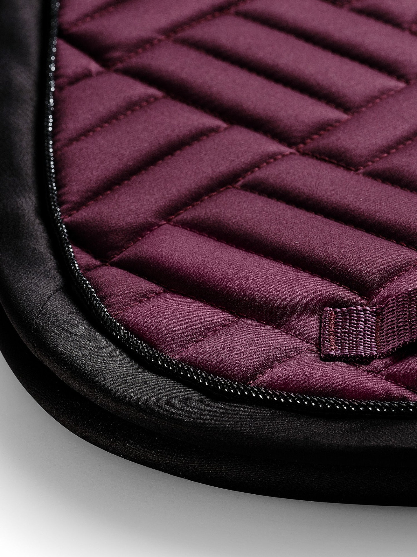 Detaljer: Sort kantbånd med sølvfarget Equestrian Stockholm-logo / Moderne quilting