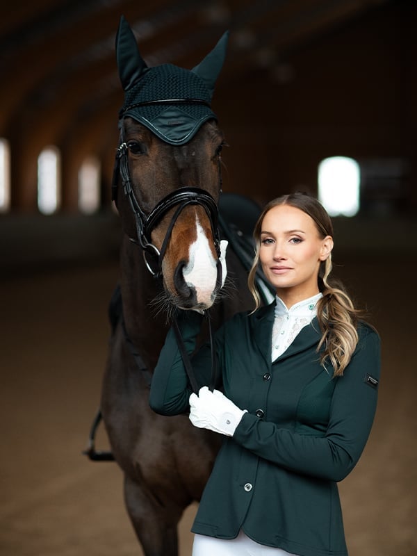 Luksuriøs, heklet ørehette i en elegant mørkegrønn nyanse med et hint av blått. Dekorert med en ton-i-ton satengpatch i front, vakker piping med sølvtråd og matchende kantbånd i mørkegrønn. Prydet med Equestrian Stockholm-merke i sort.