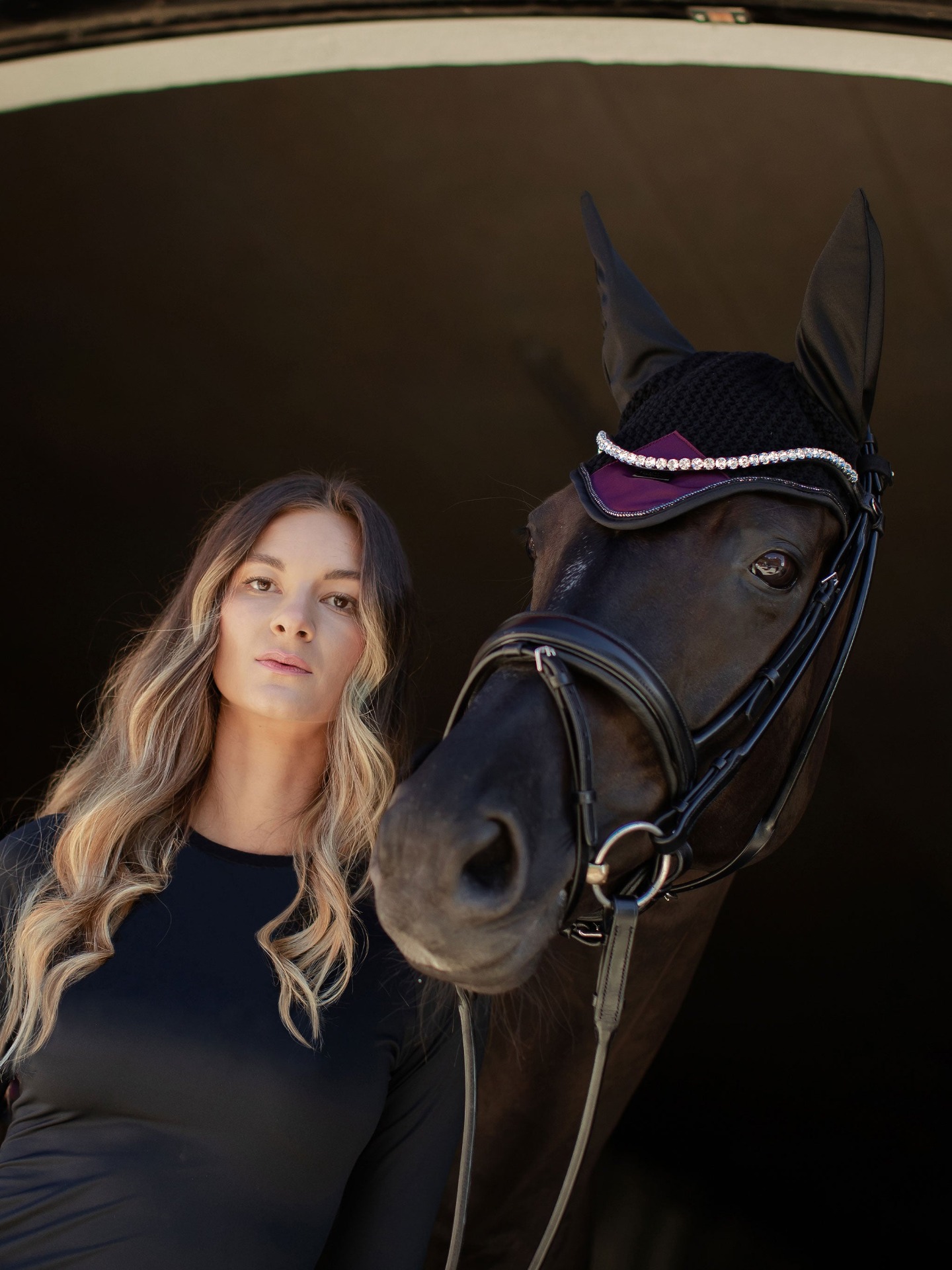 Luksuriøs heklet ørehette i sort, dekorert med en mørklilla satengpatch i front, elegant sølvfarget piping og Equestrian Stockholm-emblem i svart metall. Ørehetten gir både effektiv beskyttelse mot insekter og bidrar til å dempe støy. Elastisk stoff i ørene sørger for ekstra komfort og optimal passform. Matcher perfekt med sjabraken fra Purple Night-kolleksjonen for et helhetlig og eksklusivt uttrykk.