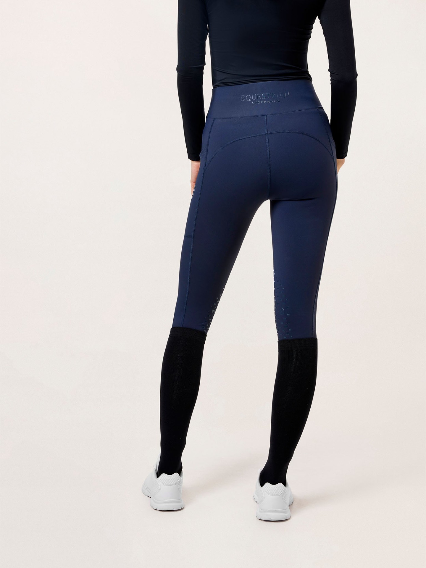Detaljer: Tone-i-tone Equestrian Stockholm-logo på venstre lomme / Tone-i-tone ES-logo midt bak i linningen