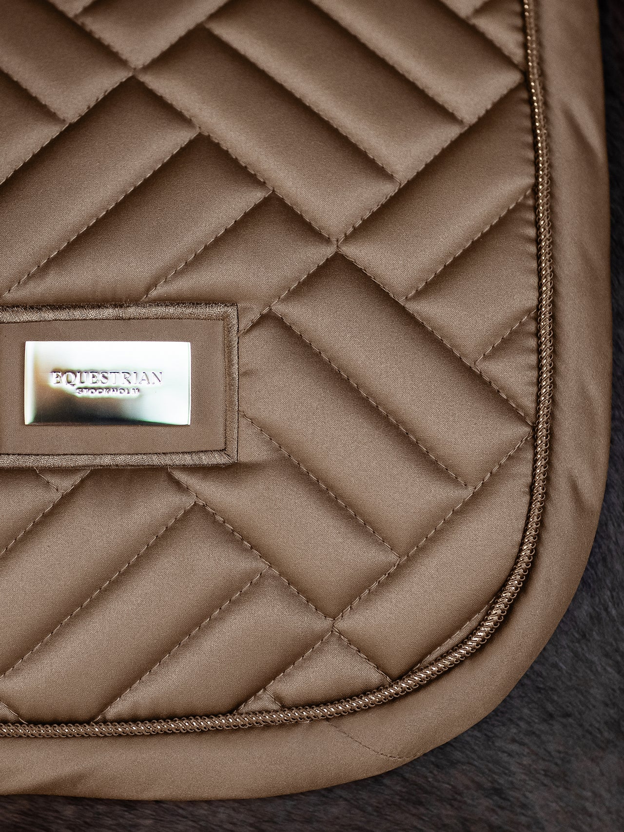 Elegant sjabrak med moderne quilting i champagne med lekre gulldetaljer. Dekorert med Equestrian Stockholm-merke i gull.