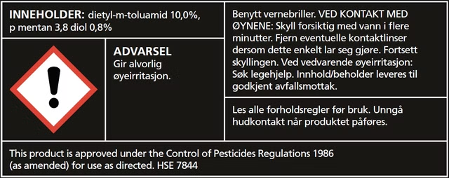 Inneholder DEET som gir effektiv beskyttelse mot fluer, mygg, knott, hestefluer og andre bitende insekter.