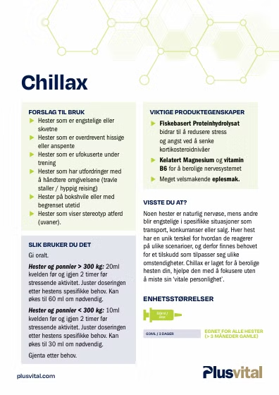 3. Meget velsmakende eplesmak Visste du at?Noen hester er naturlig nervøse, mens andre blir engstelige i spesifikke situasjoner som transport, konkurranser eller salg. Hver hest reagerer forskjellig på ulike scenarioer, og derfor trengs et tilskudd som kan tilpasses ulike omstendigheter. Chillax er formulert for å berolige hesten din, hjelpe den med å fokusere uten å miste sin "viktige skarphet". Enhetsstørrelse / Dager60ml. / 3 dager. Innhold: