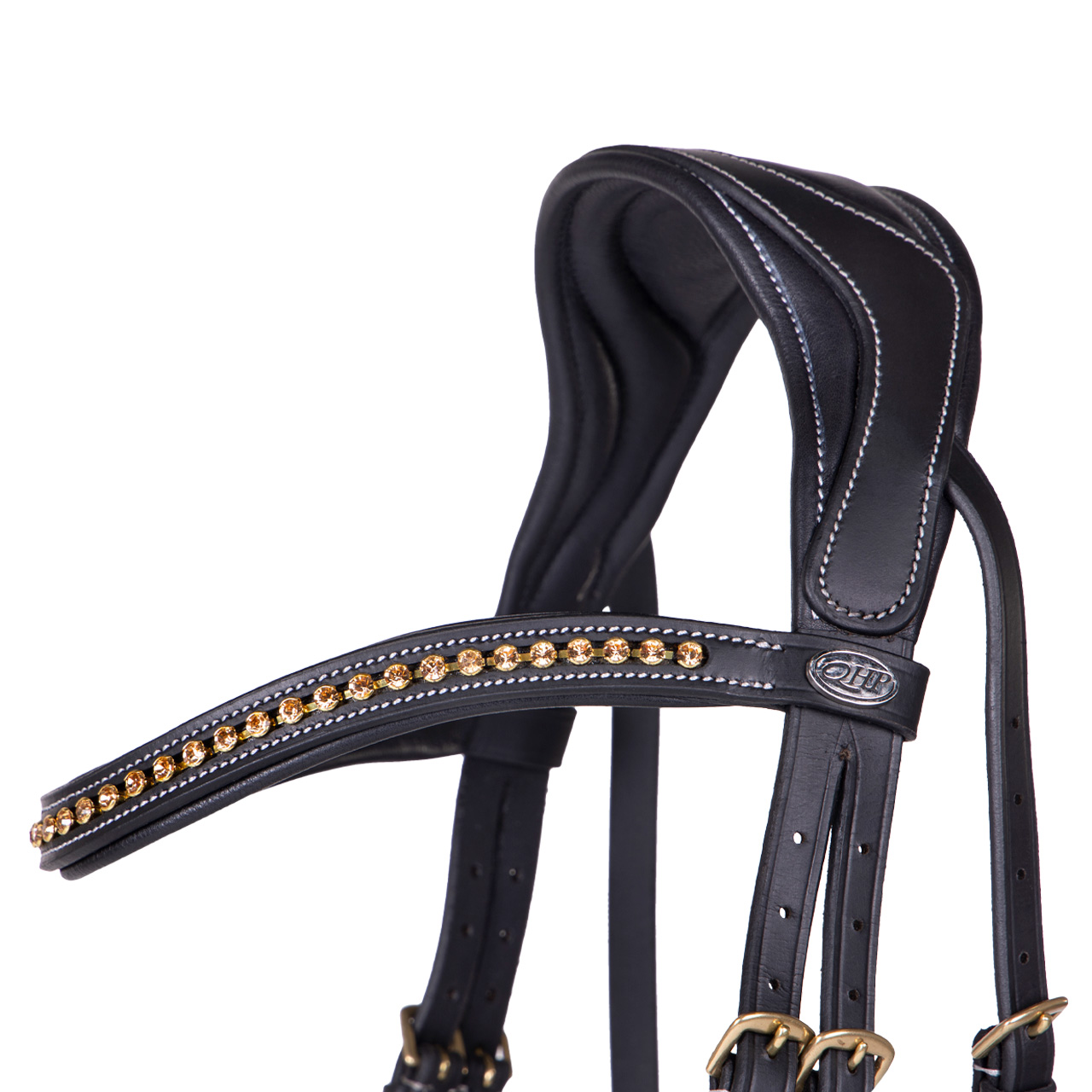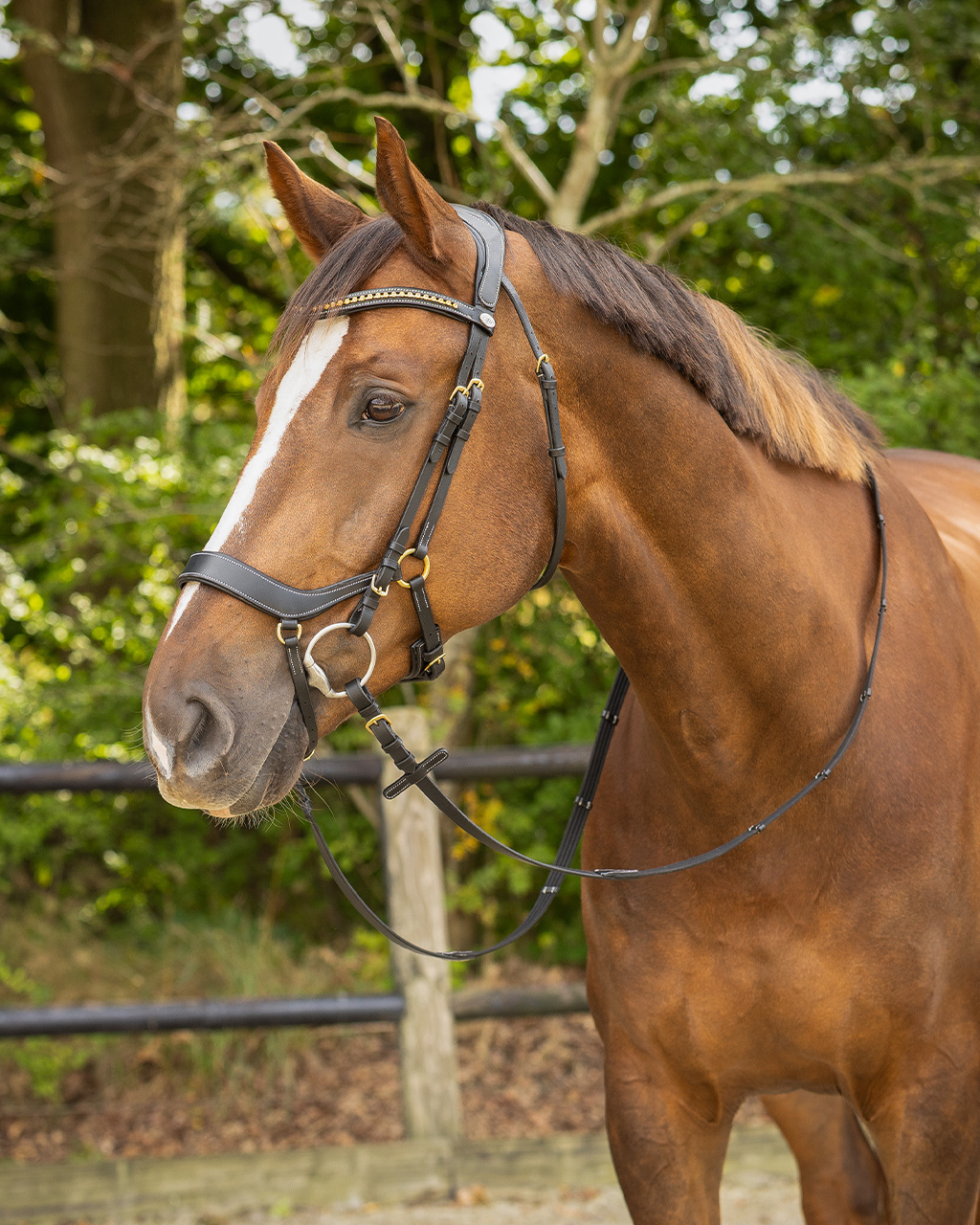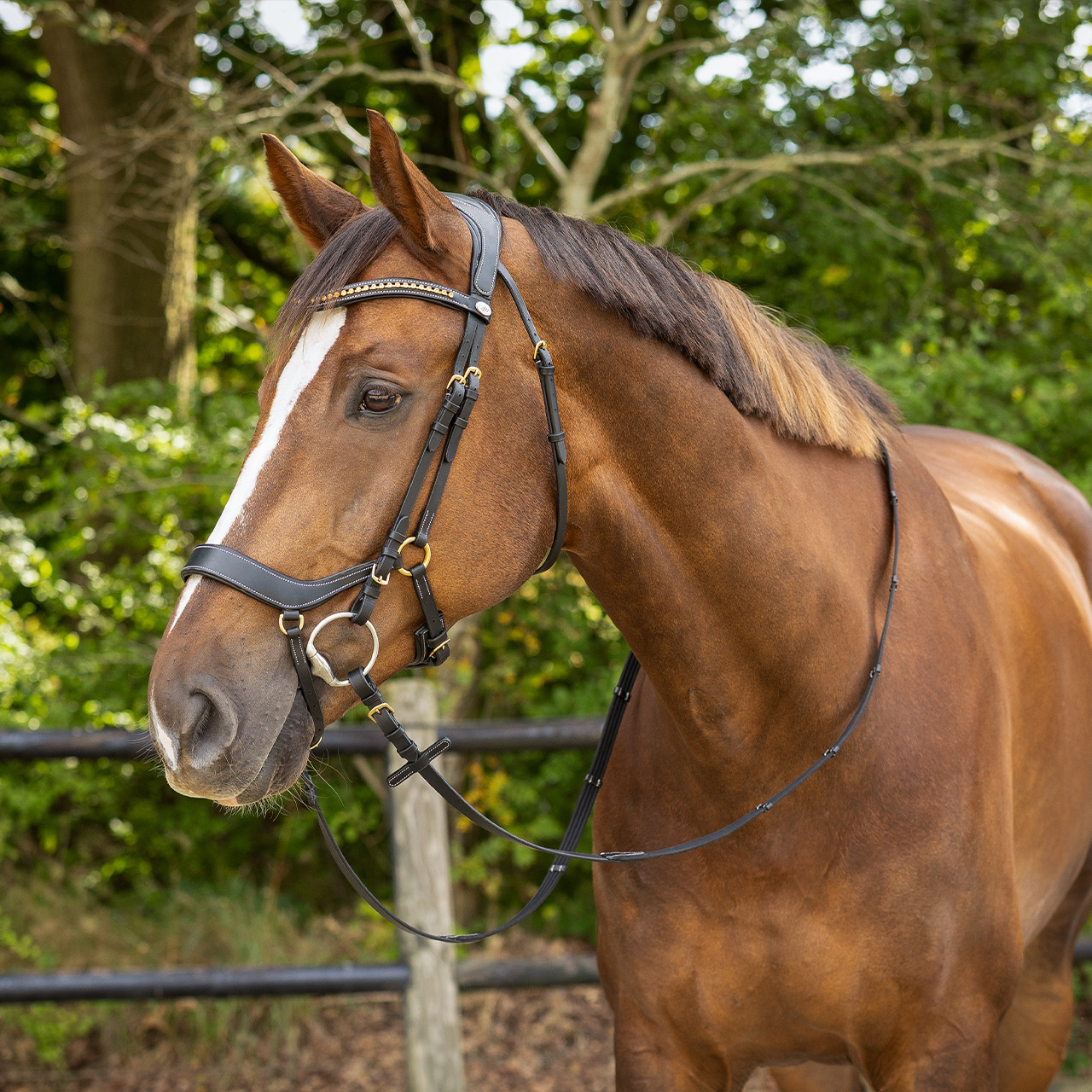 Hodelaget er laget i kvalitetslær med myk polstring på trykkpunkter, og leveres med matchende tøyler. Designet kombinerer funksjon og et stilrent uttrykk med dekorativt pannbånd.