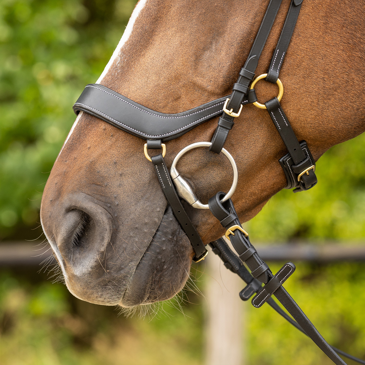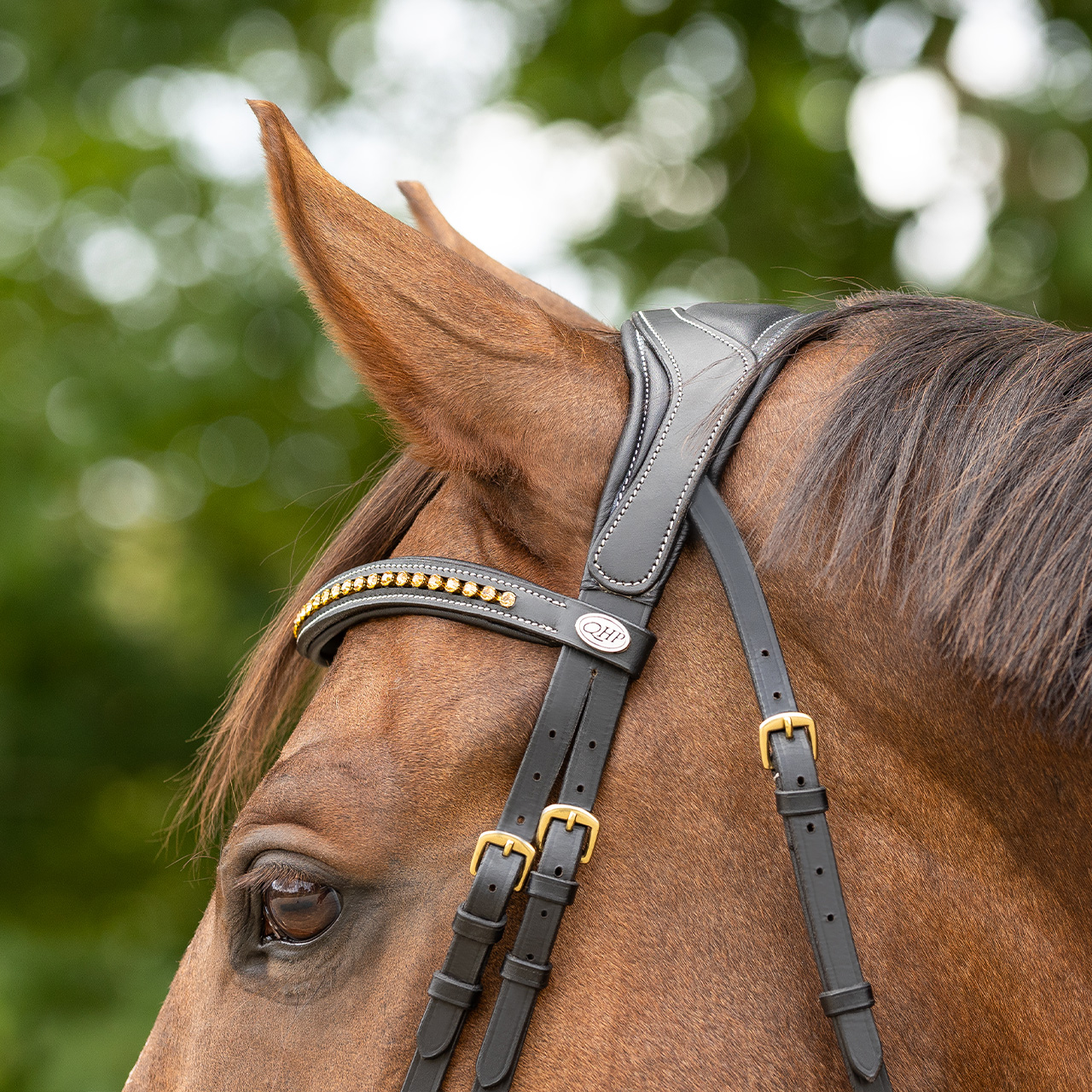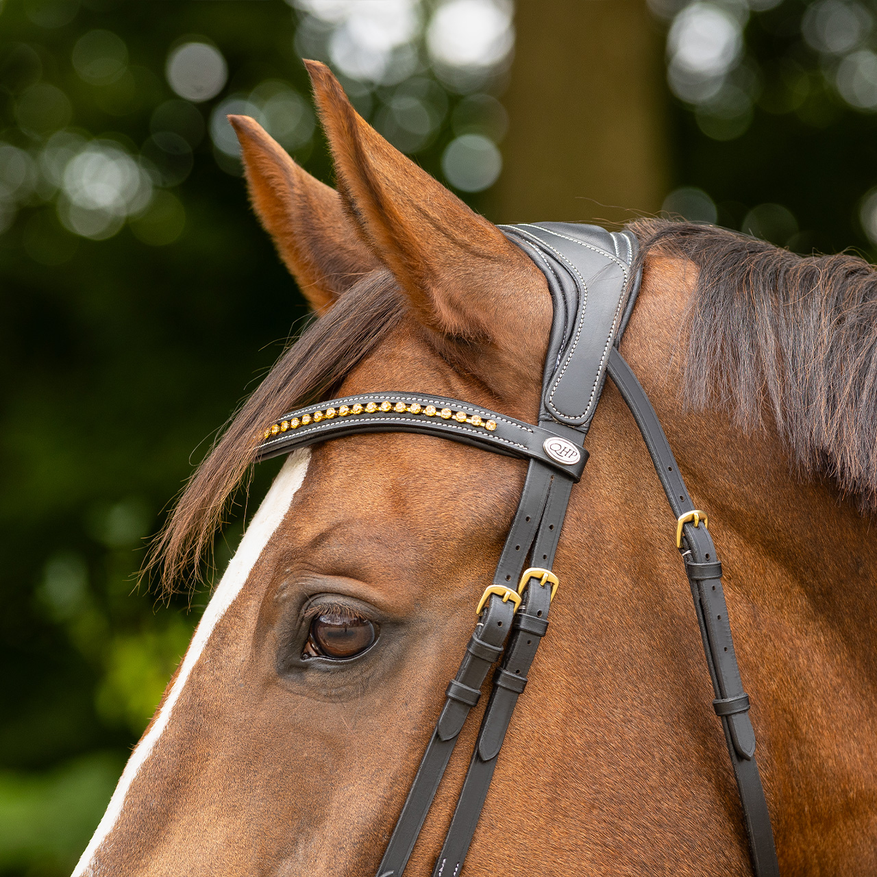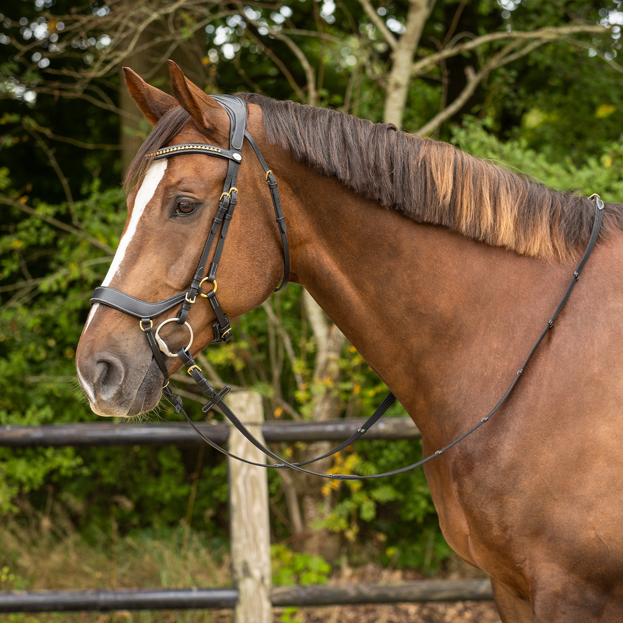 Hodelaget er laget i kvalitetslær med myk polstring på trykkpunkter, og leveres med matchende tøyler. Designet kombinerer funksjon og et stilrent uttrykk med dekorativt pannbånd.